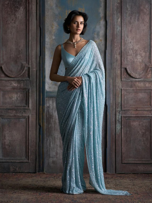 Georgette Sky Blue Color Sequence Saree For Party Wear