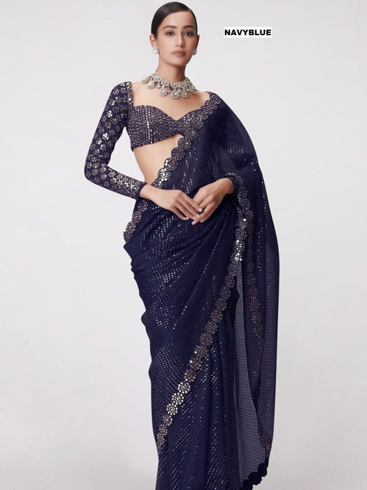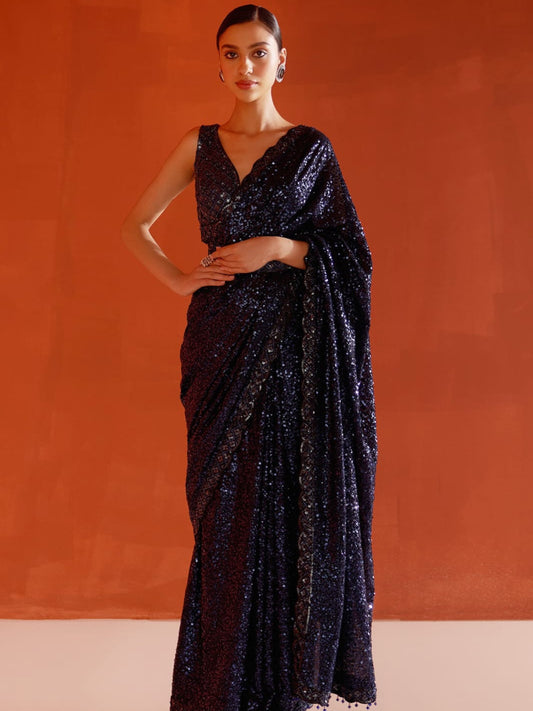 Navy Blue Faux Georgette Sequin Saree Online – Bollywood Celebrity Saree for Women's