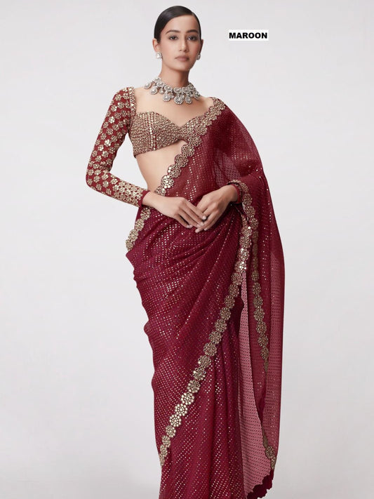 Maroon Faux Georgette Sequin Saree Online – Bollywood Celebrity Saree for Women's