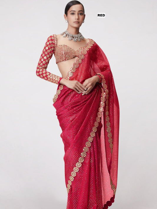 Red Celebrity Saree with Sequin Embroidery Bollywood Partywear Saree for Women