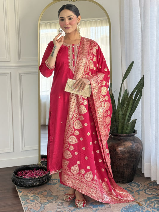 Viscose Chanderi Embroidered Kurta Set with Jacquard Dupatta For Women's