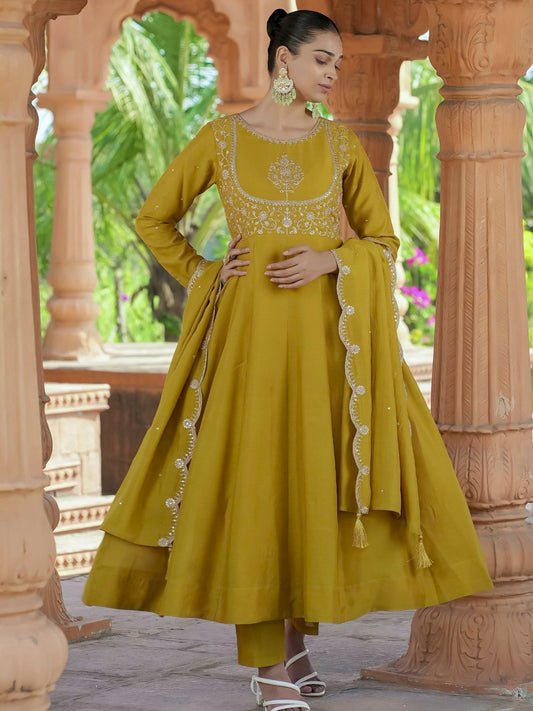 Elegant Yellow Mustard Vichitra Silk Embroidered Kurta Set