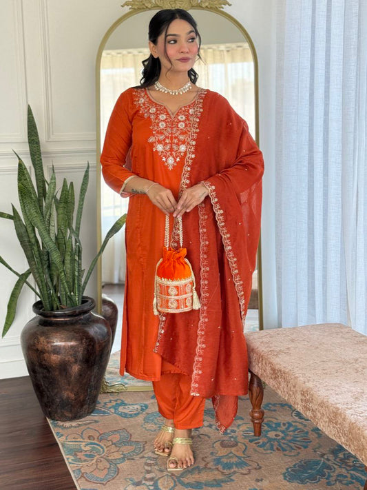 Women’s Kurta Set Orange Heavy Viscose Chanderi Embroidered with Cotton Chanderi Dupatta