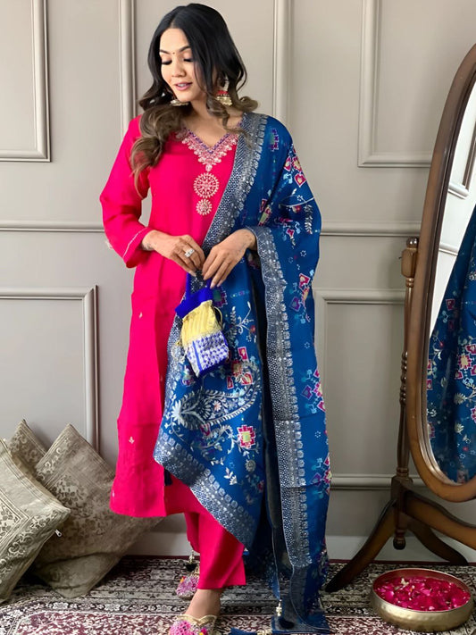 Royal Weave Designer Viscose Chanderi Embroidery Set with Premium Dupatta For Women's