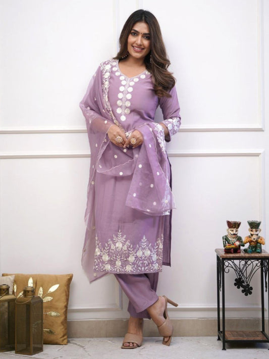 Purple Roman Silk Kurta Set with Embroidered Organza Dupatta