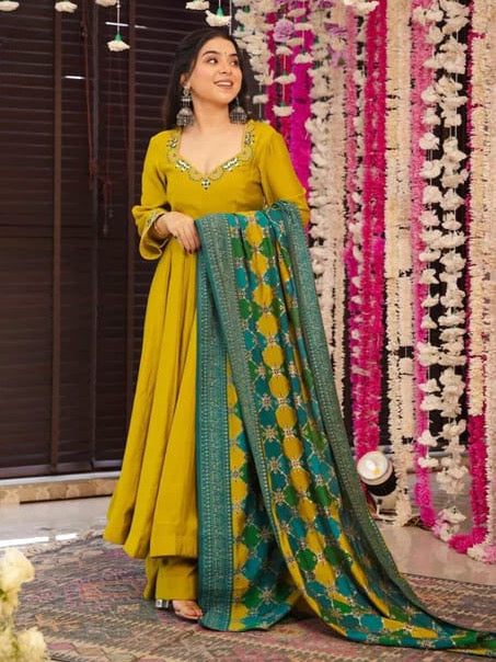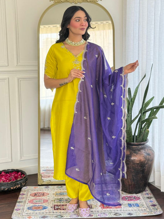 Elegant Lemon Viscose Chanderi Embroidered Kurta Set with Chanderi Silk Dupatta