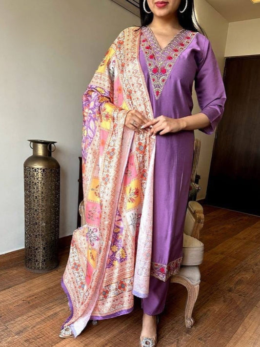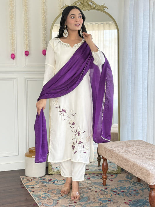 Women's PV Chanderi Embroidered Kurta Set with Printed Dupatta