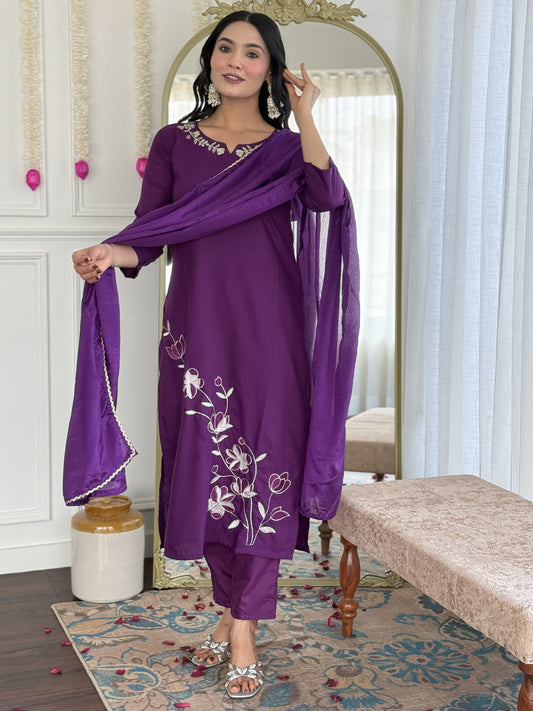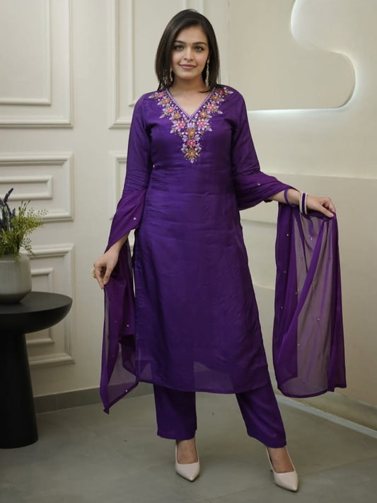 Purple Viscose Rayon Embroidered Kurta Set with Chinon Dupatta