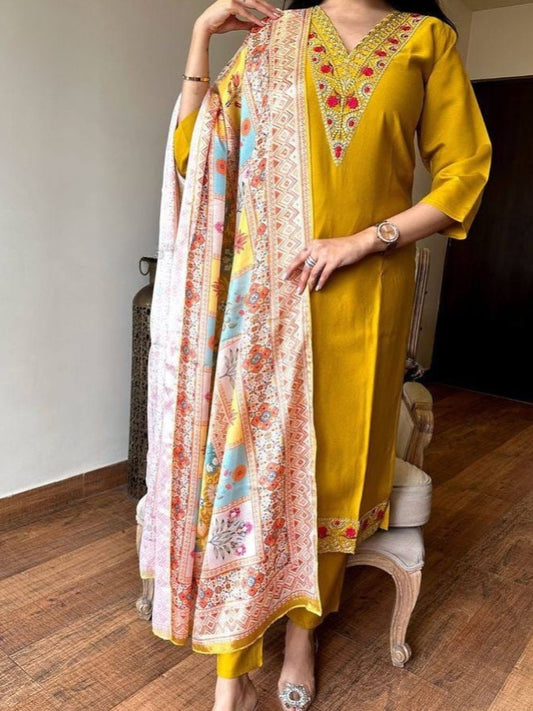 Lemon Heavy Rayon Embroidered Kurta Set with Tebby Digital Print Dupatta For Women's