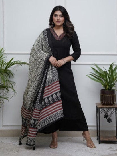 Black Parampara Embroidered Kurta Set with Chanderi Printed Dupatta