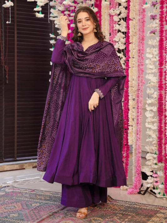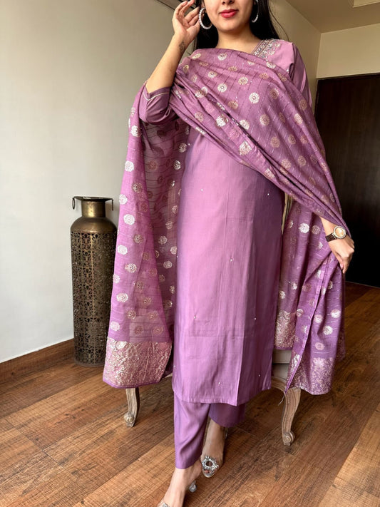 Traditional Purple Chanderi Kurta Set with Soft Silk Crepe Dupatta