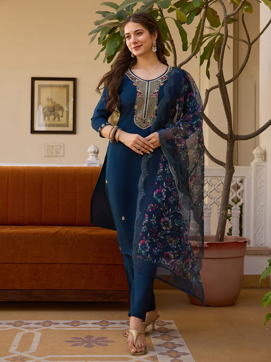 Women's Viscose Kurta Set with Embroidery & Printed Organza Dupatta