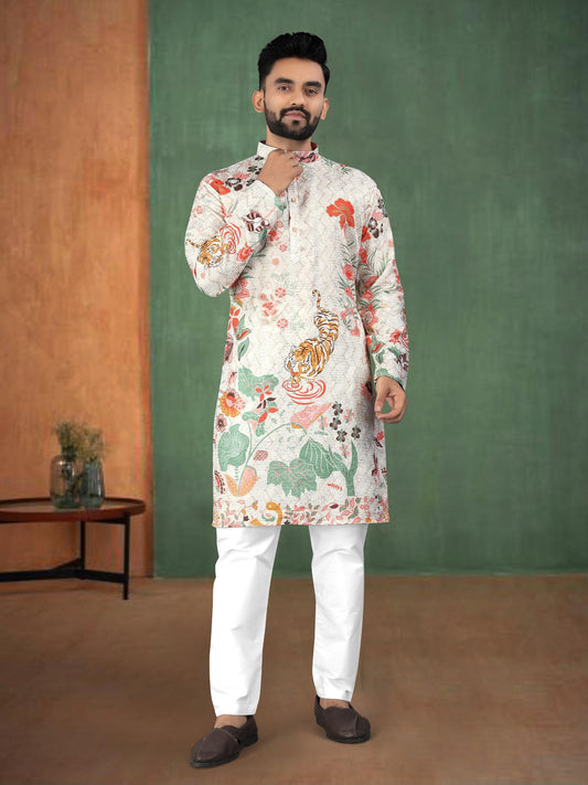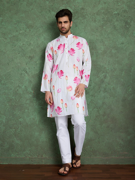 White Pink Designer Viscose Kurta Set for Men – Digital Print Work with Pajama