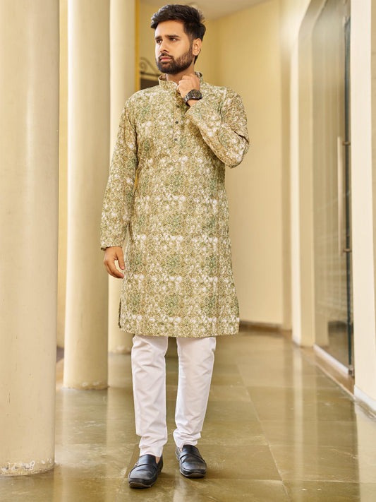 Olive Green Thread Embroidered Kurta Set Heavy Rayon For Men's