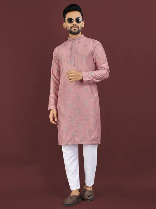 Dusty Rose Thread Embroidered Kurta Set Heavy Rayon For Men's