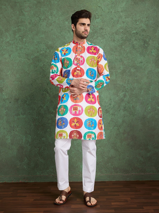 Men’s Multicolour Kurta Set in Heavy Rayon with Print & Embroidery Work