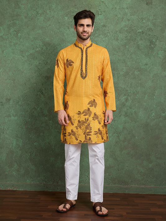 Printed & Embroidered Men’s Kurta Set – Heavy Rayon – Mustard Yellow