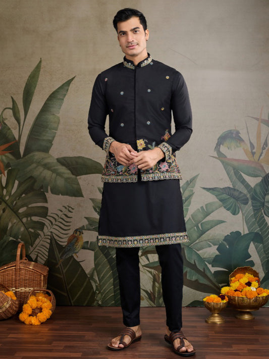Men’s Black Kurta Set in Heavy Rayon with Print & Embroidery Detail