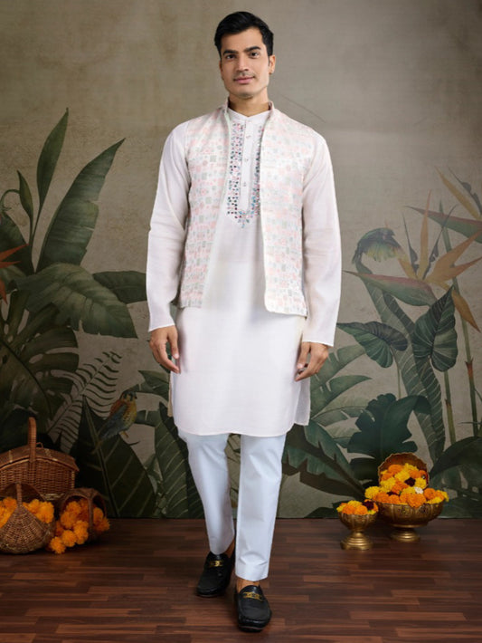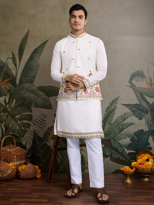 Off-White Royale Thread Embroidered Kurta Set with Jacket – Luxe Viscose Silk Style For Men's