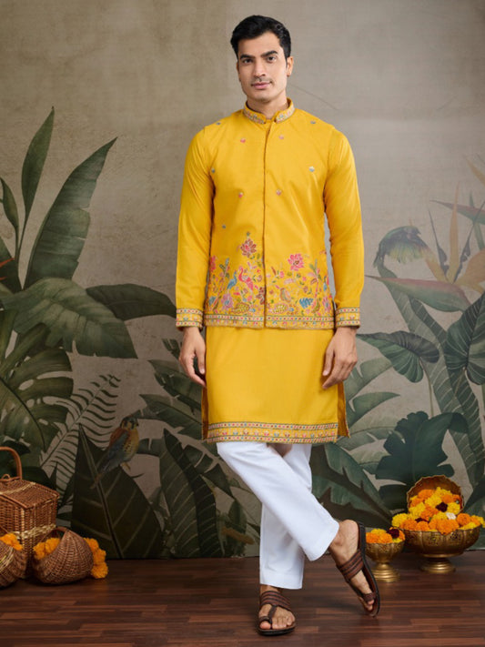 Mustard Yellow Royale Thread Embroidered Kurta Set with Jacket – Luxe Viscose Silk Style For Men's