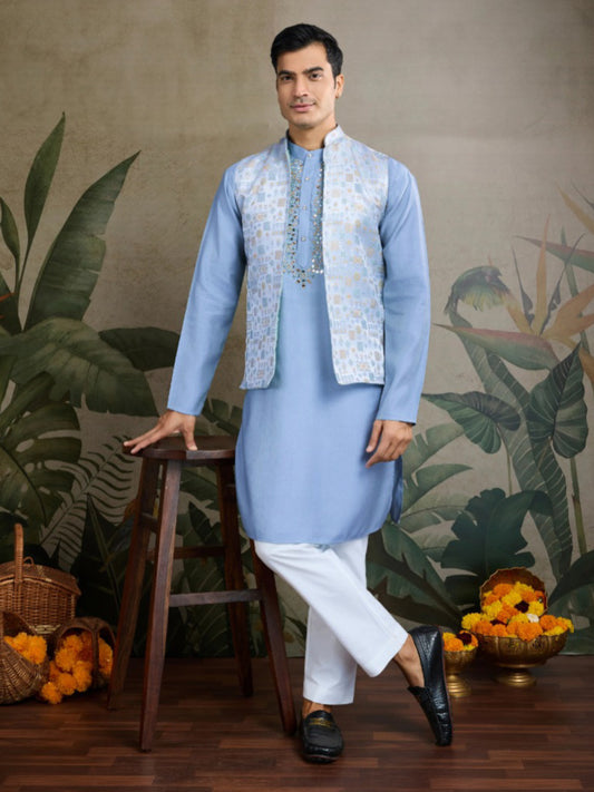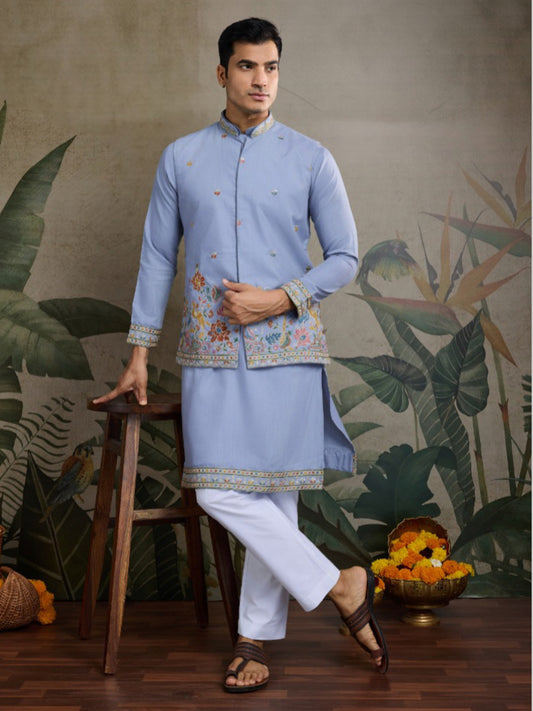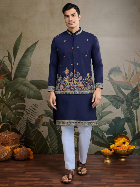 Blue Royale Thread Embroidered Kurta Set with Jacket – Luxe Viscose Silk Style For Men's