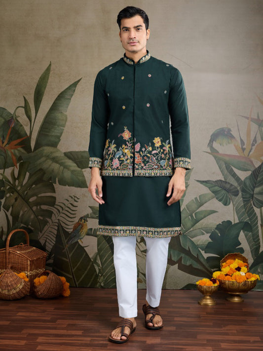 Teal Green Royale Thread Men's Embroidered Kurta Set with Jacket – Luxe Viscose Silk Style For Men's