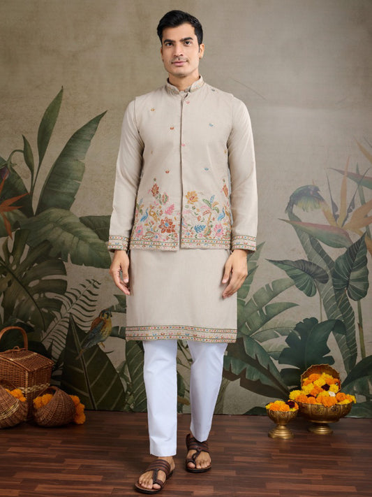 Pale Gold Royale Thread Embroidered Kurta Set with Jacket – Luxe Viscose Silk Style For Men's