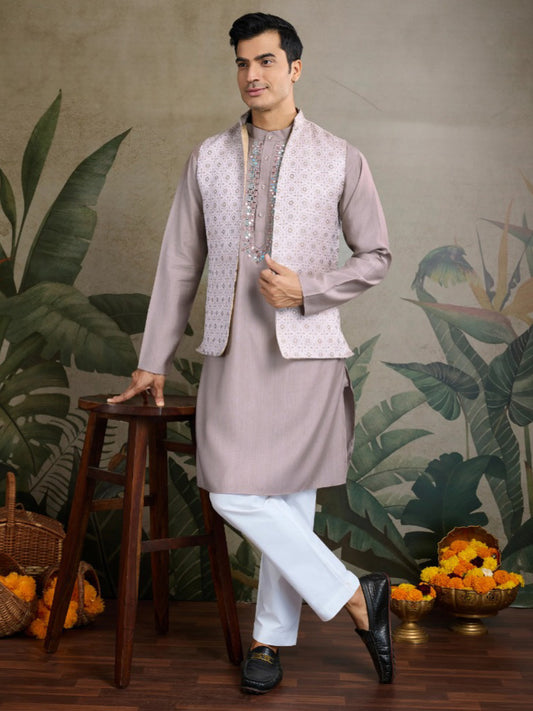 Plum Royale Thread Embroidered Kurta Set with Jacket – Luxe Viscose Silk Style For Men's