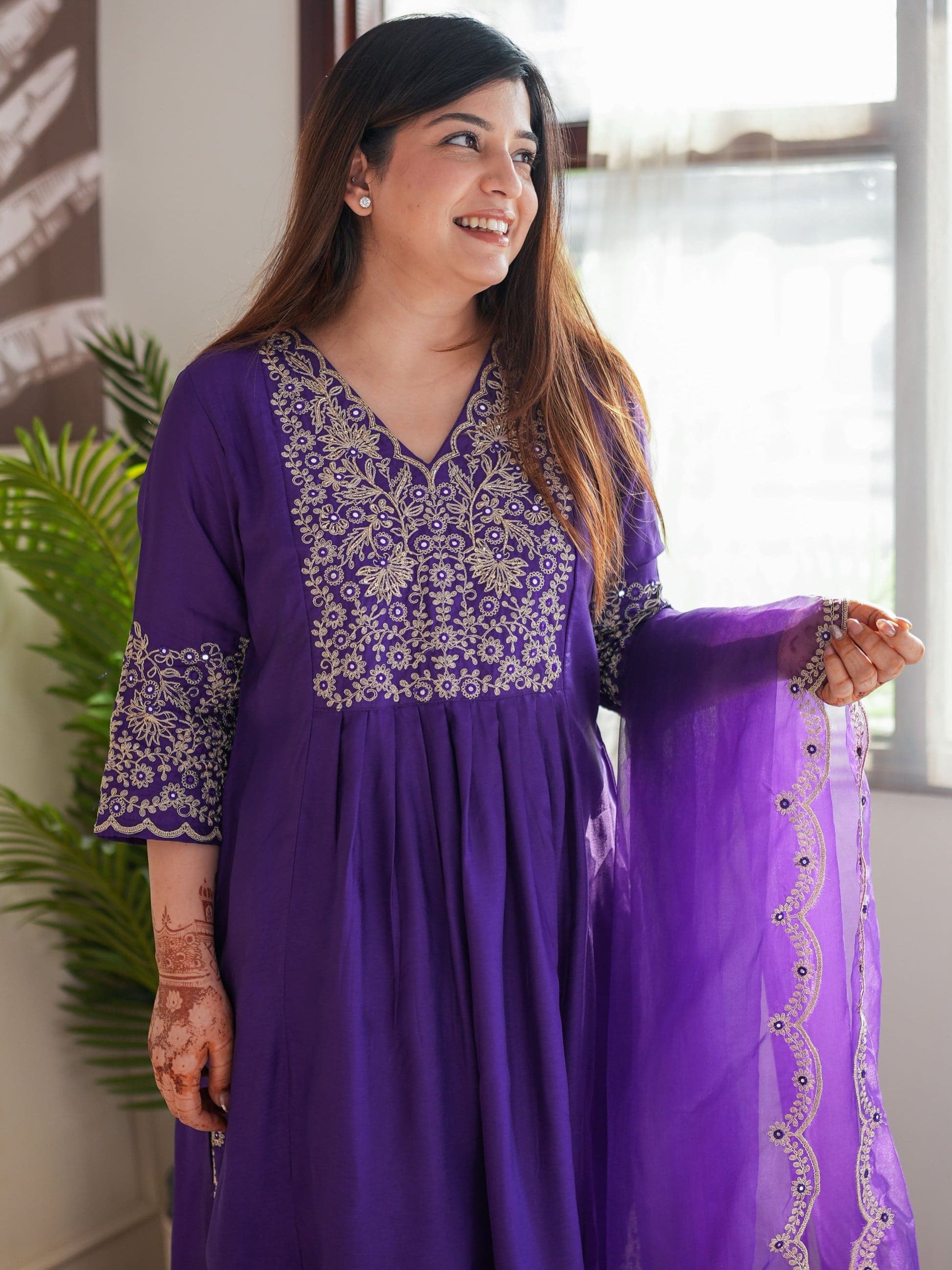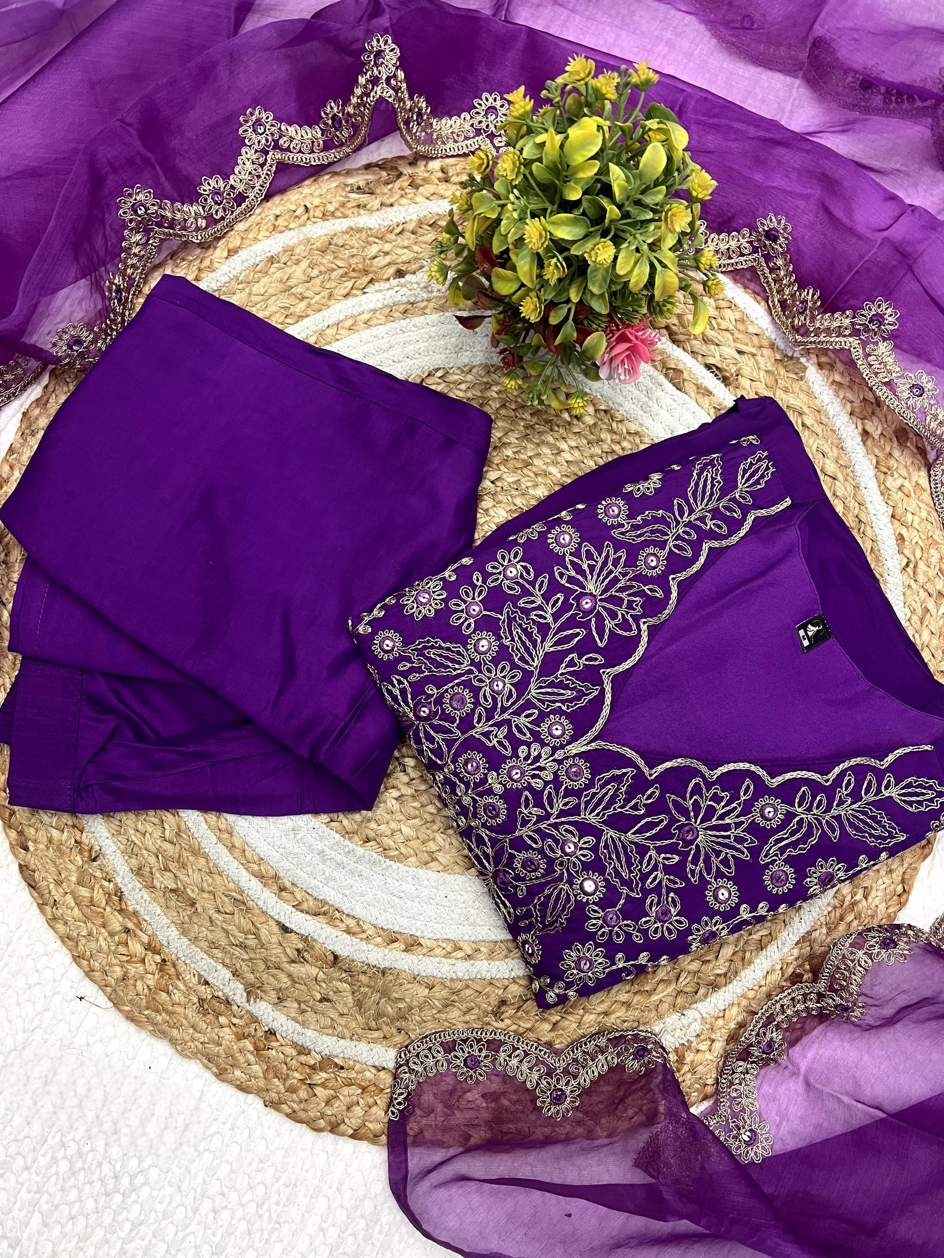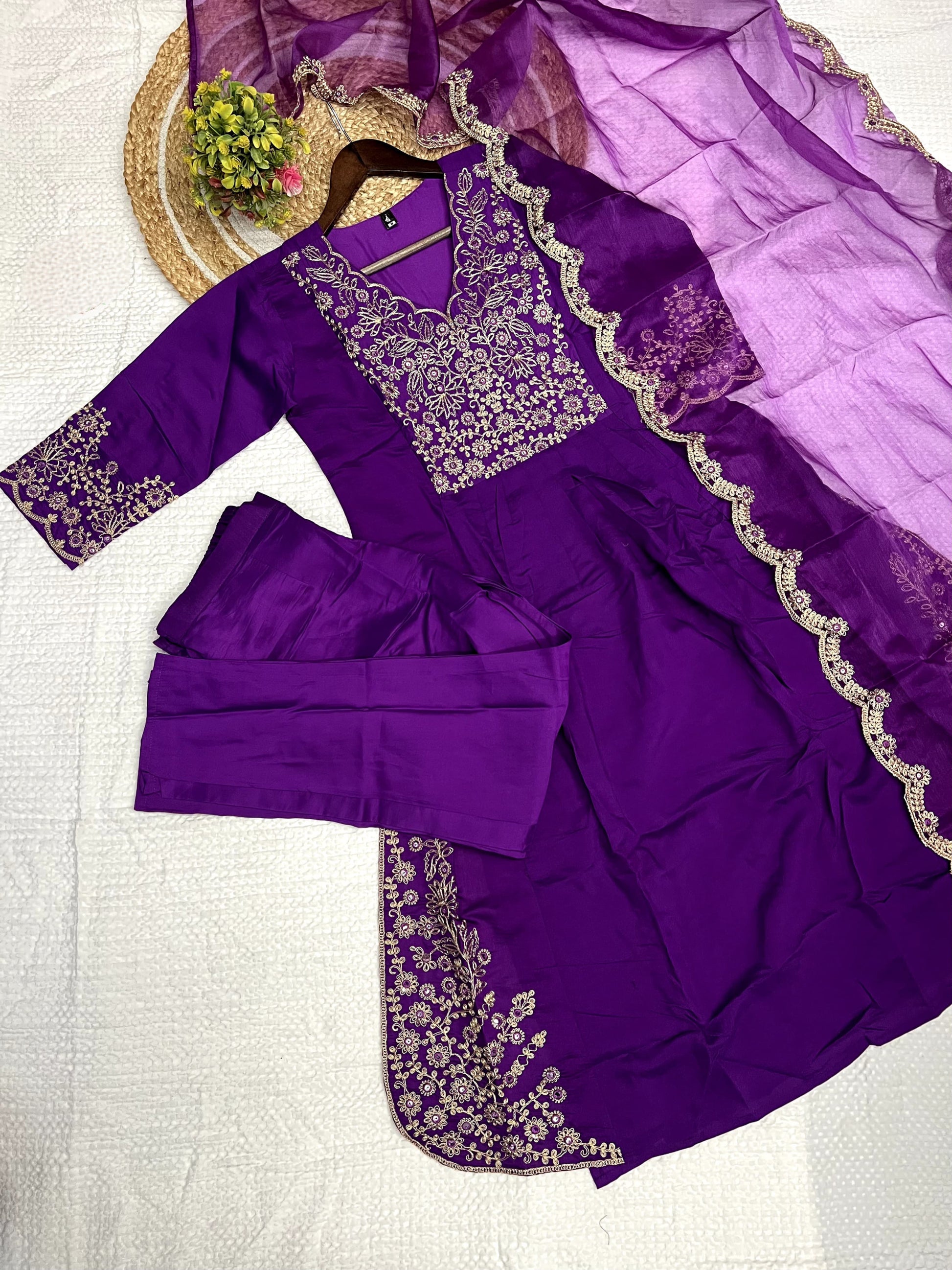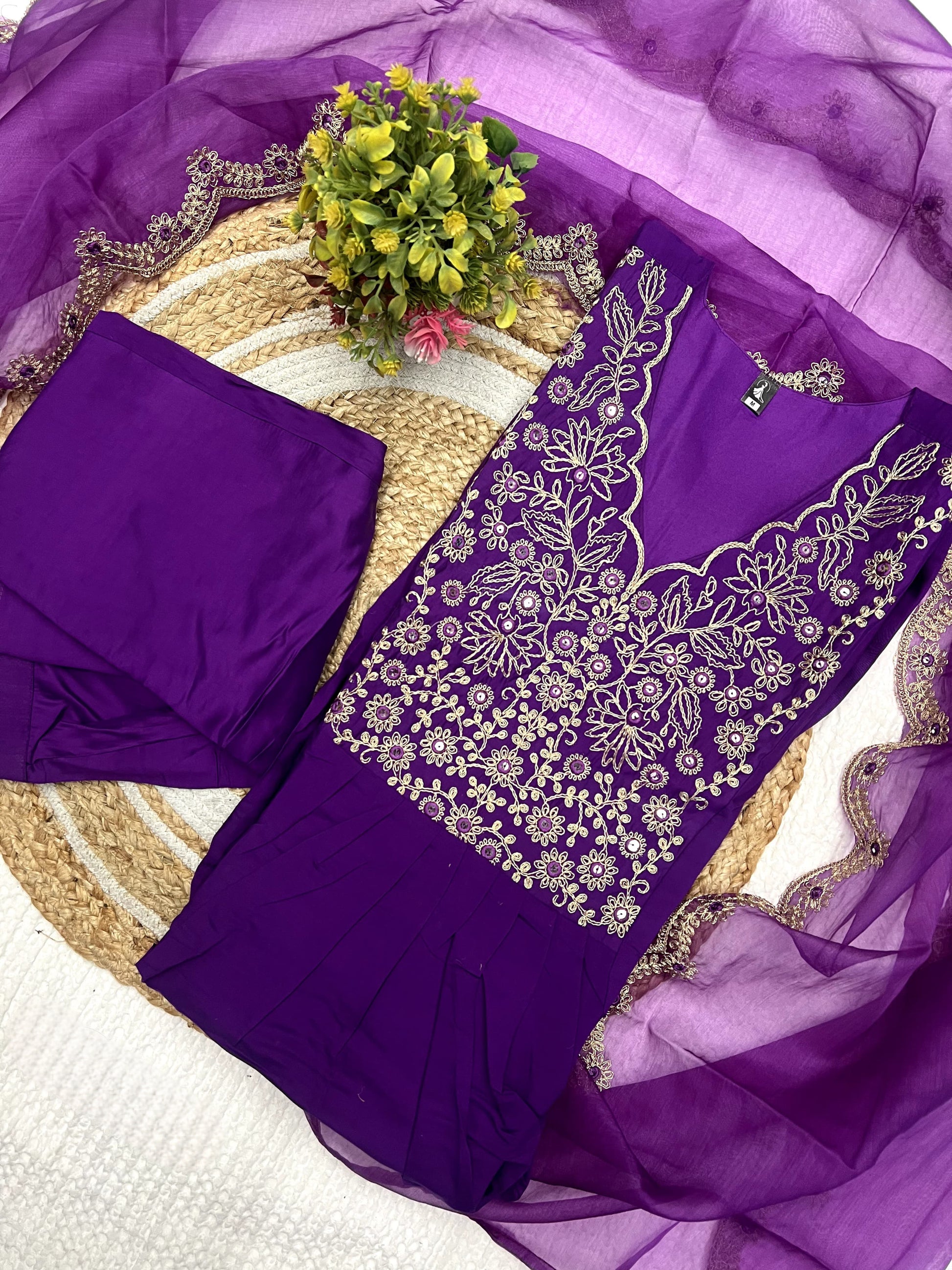 Elegant Purple Color Heavy Viscose Chanderi Kurta Set With Organza Dupatta For Women
