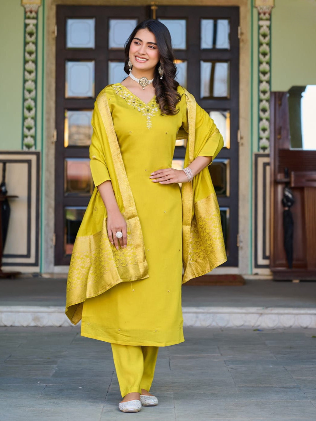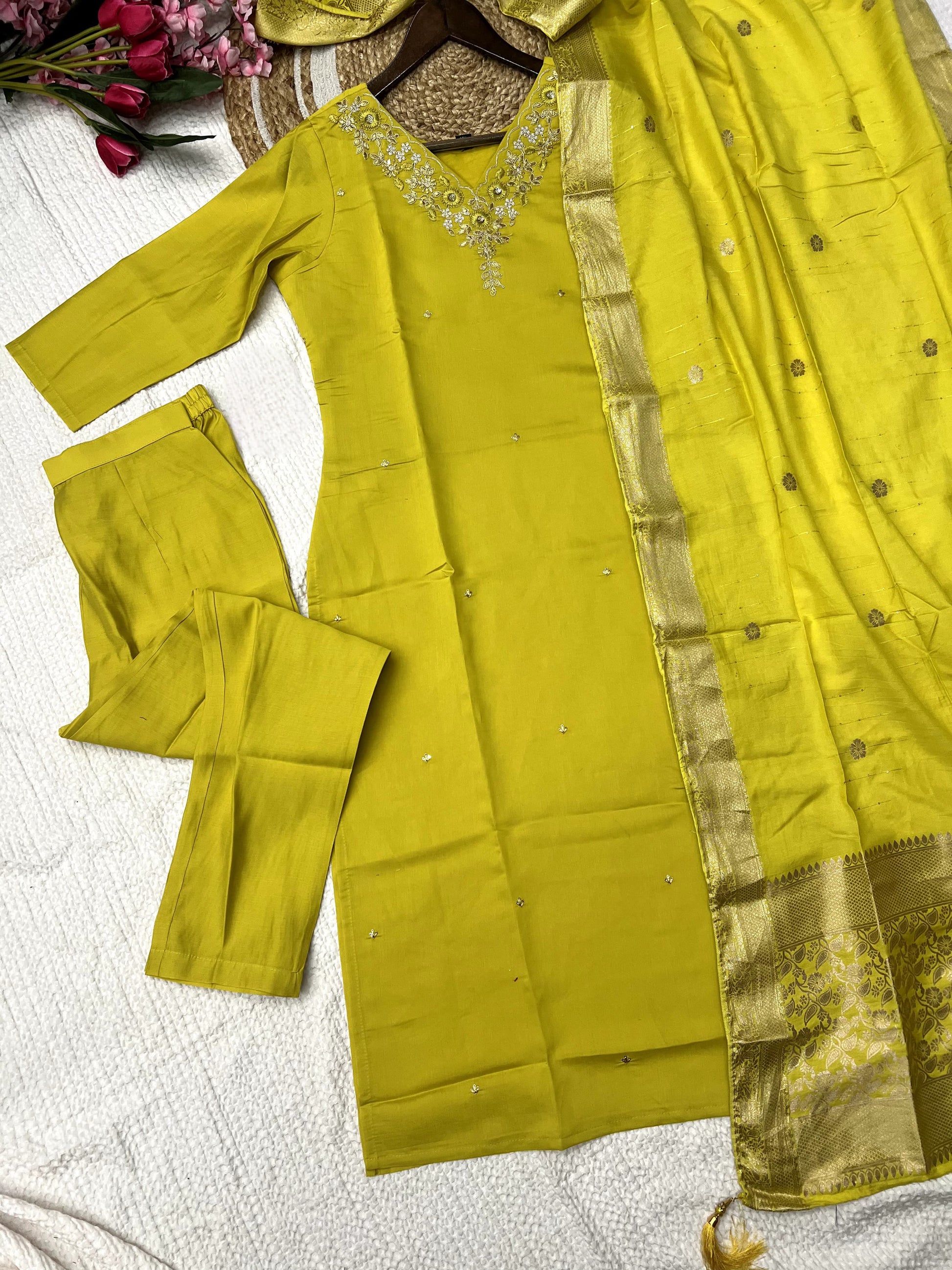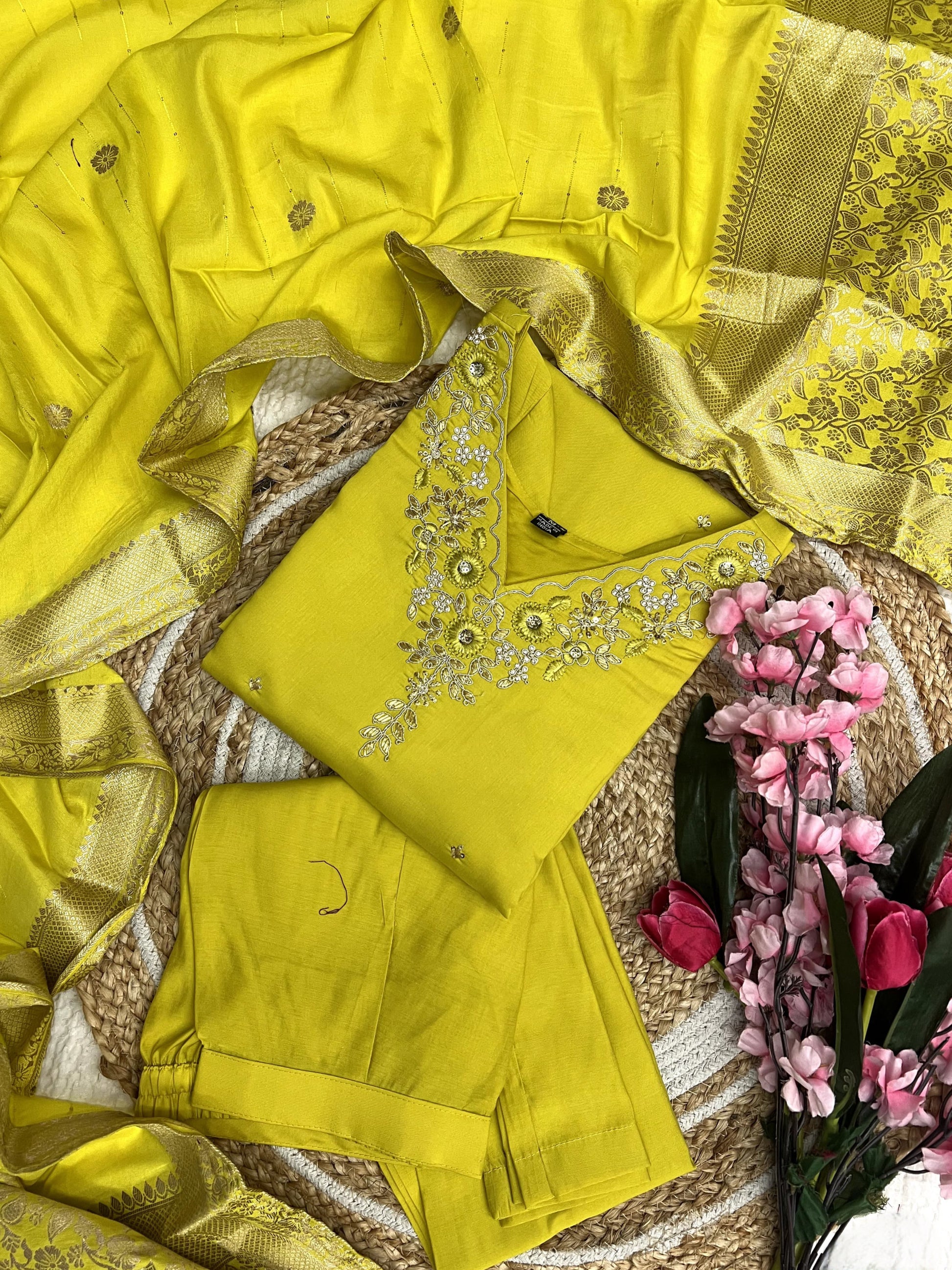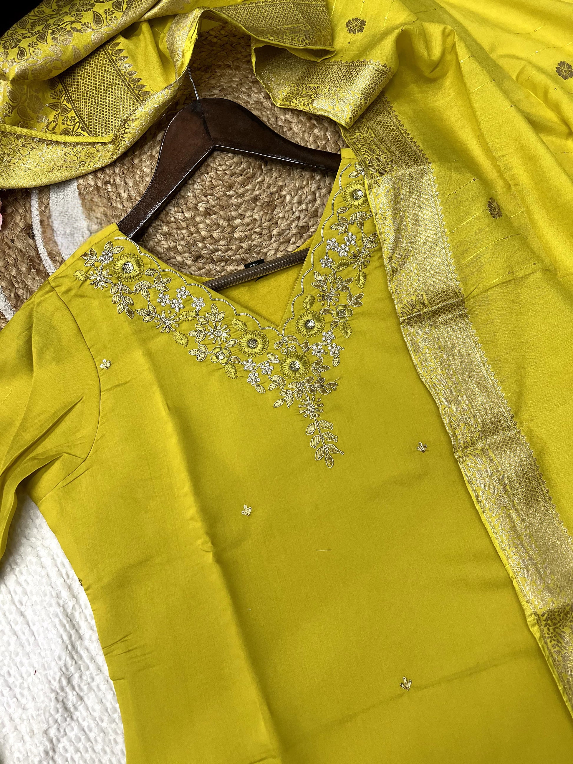 Product Description Of Florent Yellow Roman Silk Kurta Set For Women