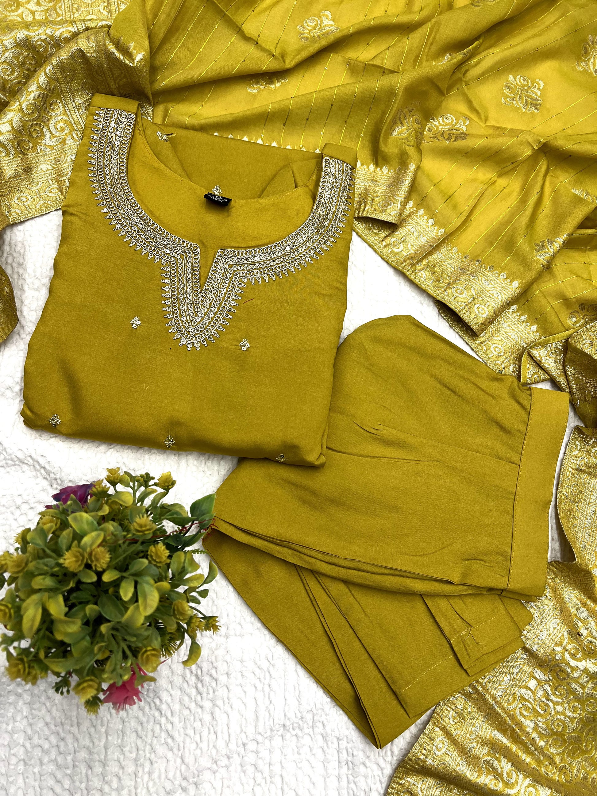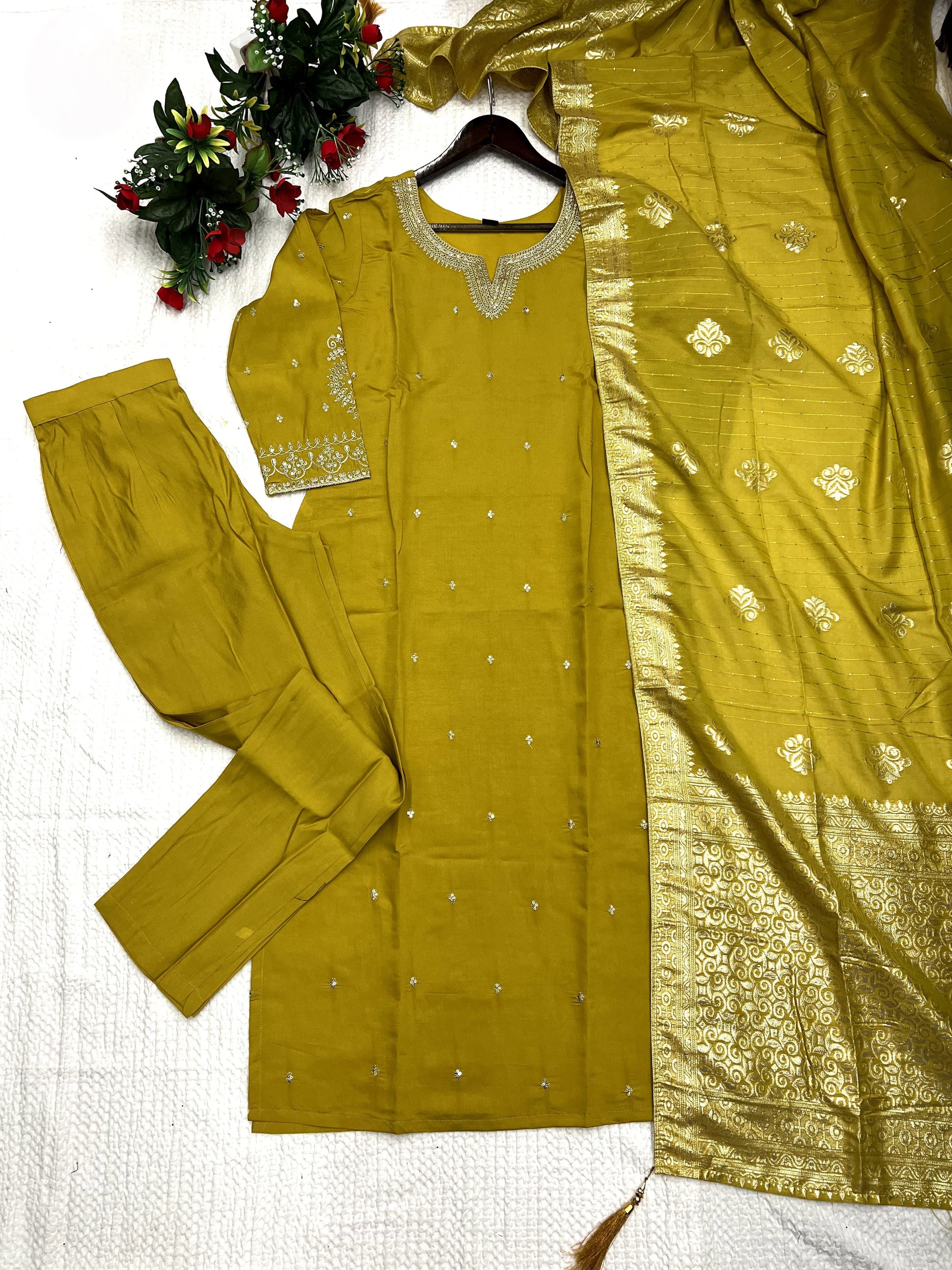 Mehandi Green Roman Silk Embroidered Kurta Set with Jacquard Dupatta – Women's Ethnic Wear