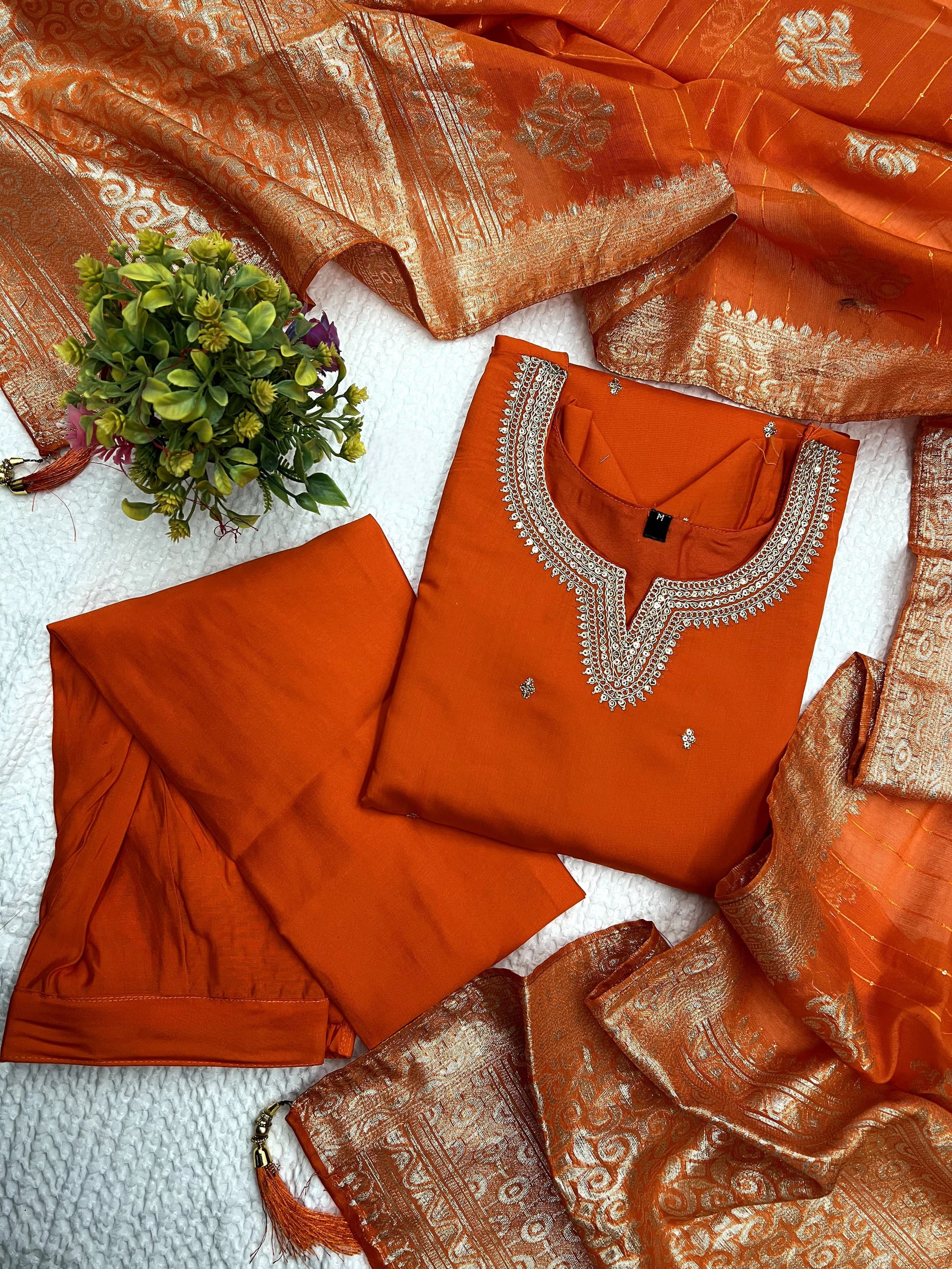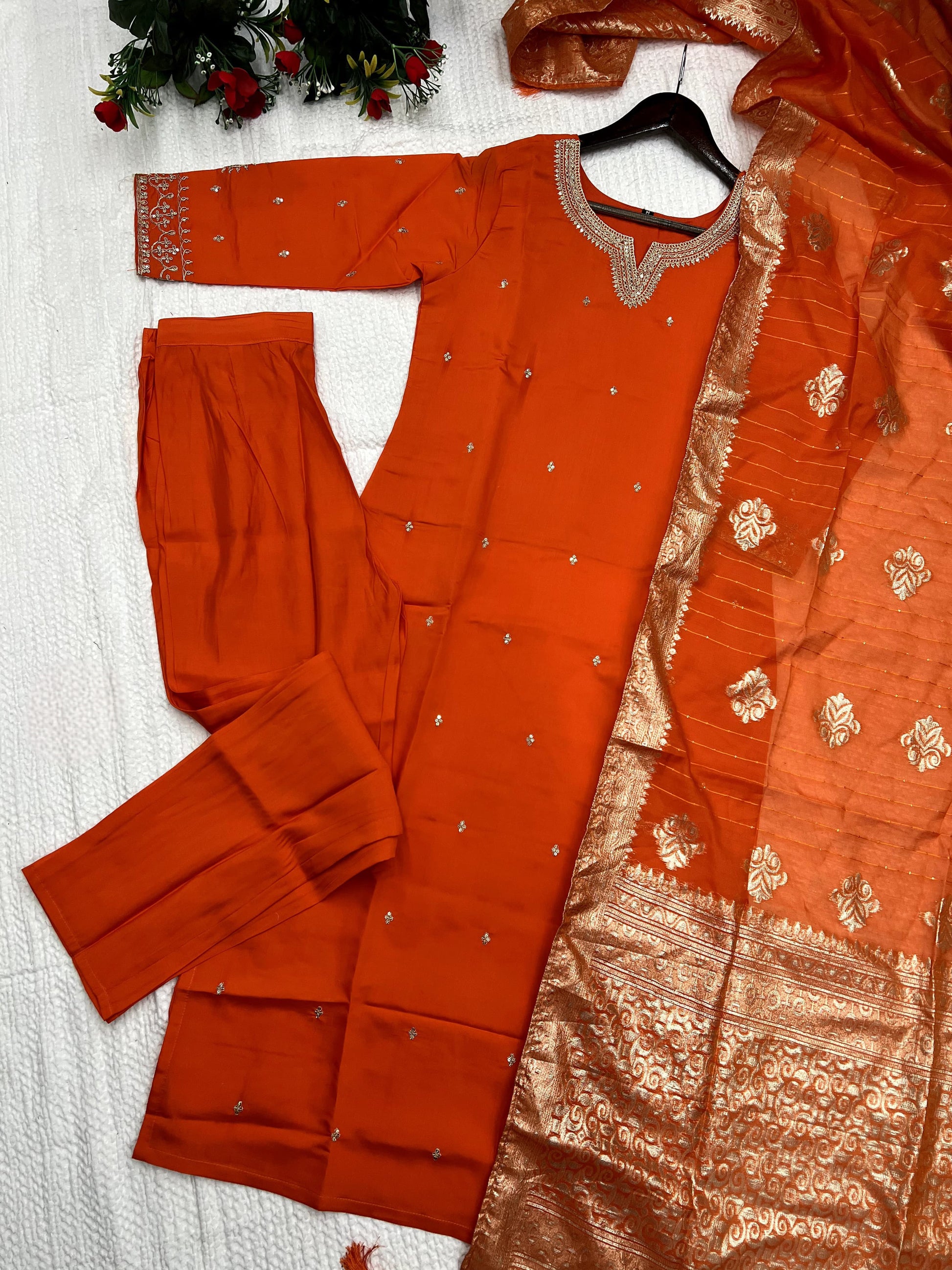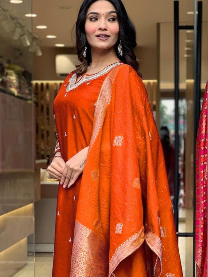 Orange Roman Silk Embroidered Kurta Set with Jacquard Dupatta – Women's Ethnic Wear