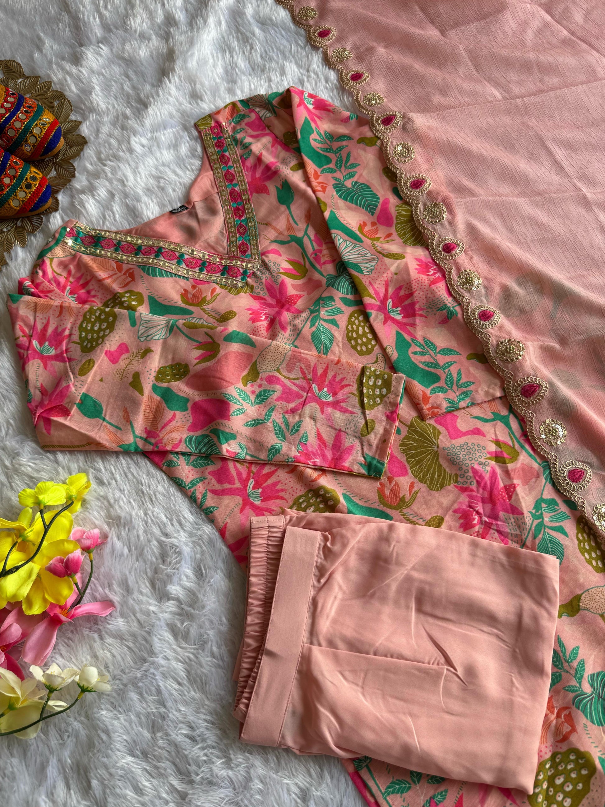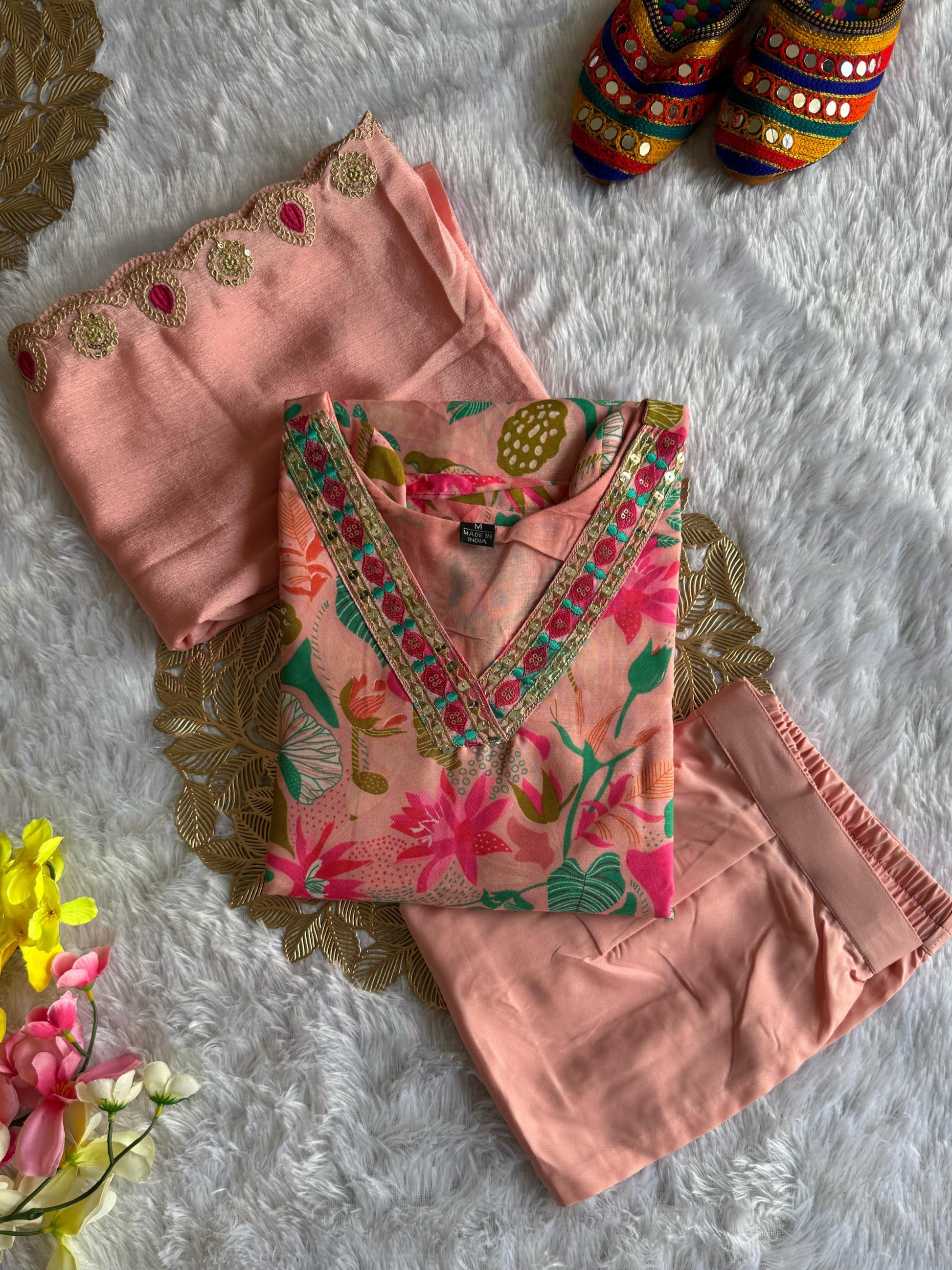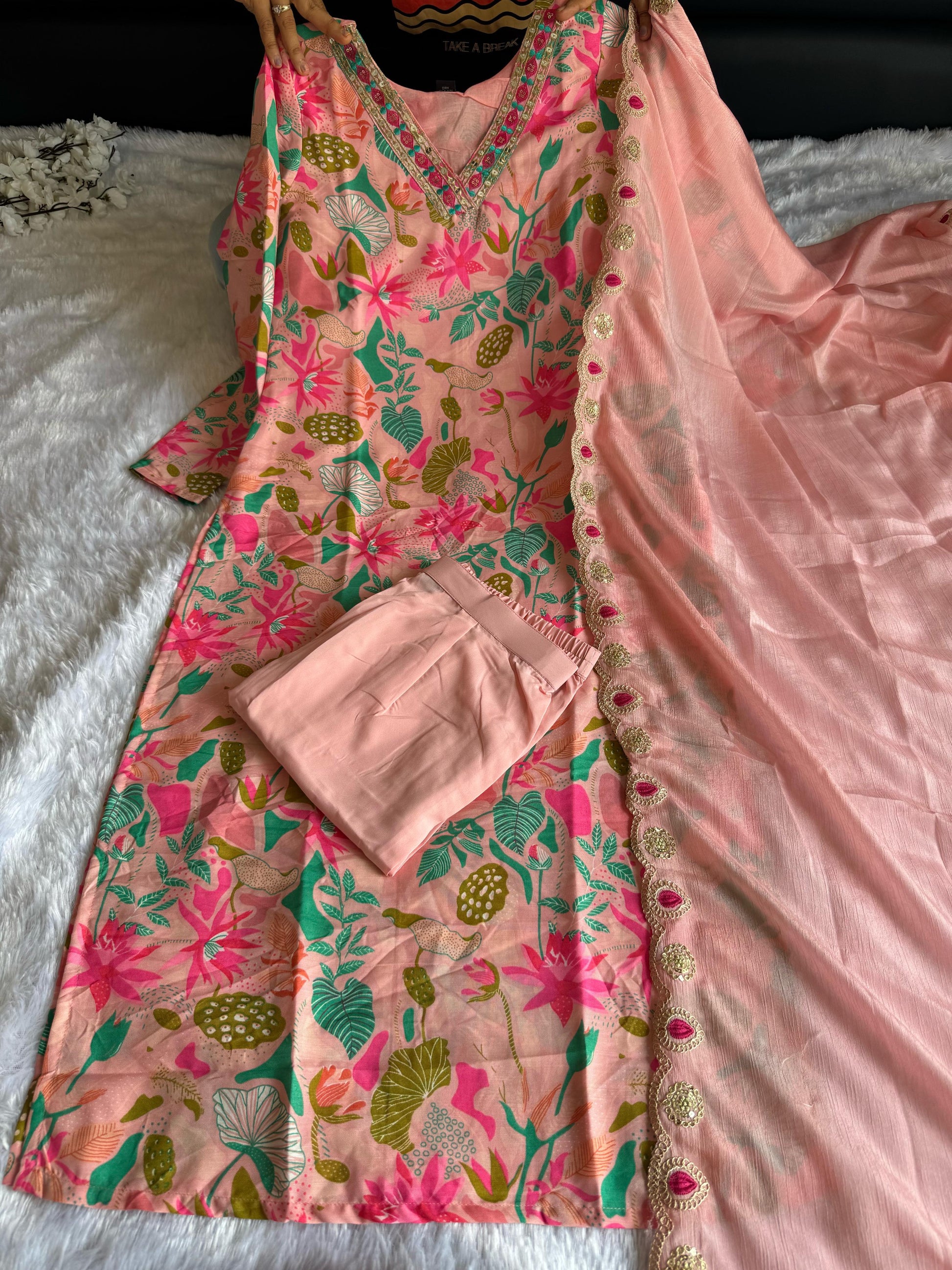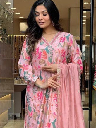 Pink Reyon Slub Printed & Embroidered Kurta Set with Chinnon Dupatta – Women's Ethnic Wear
