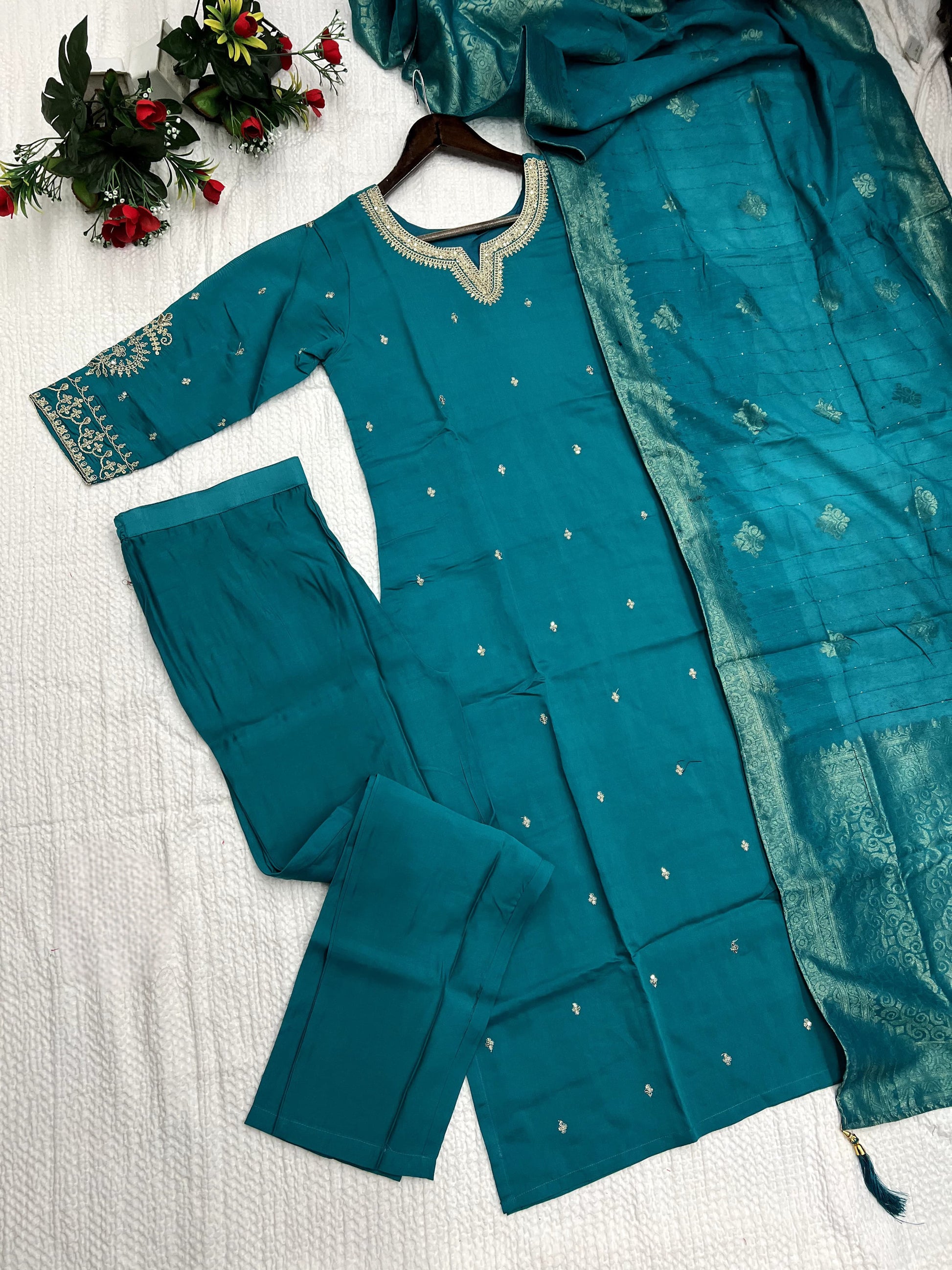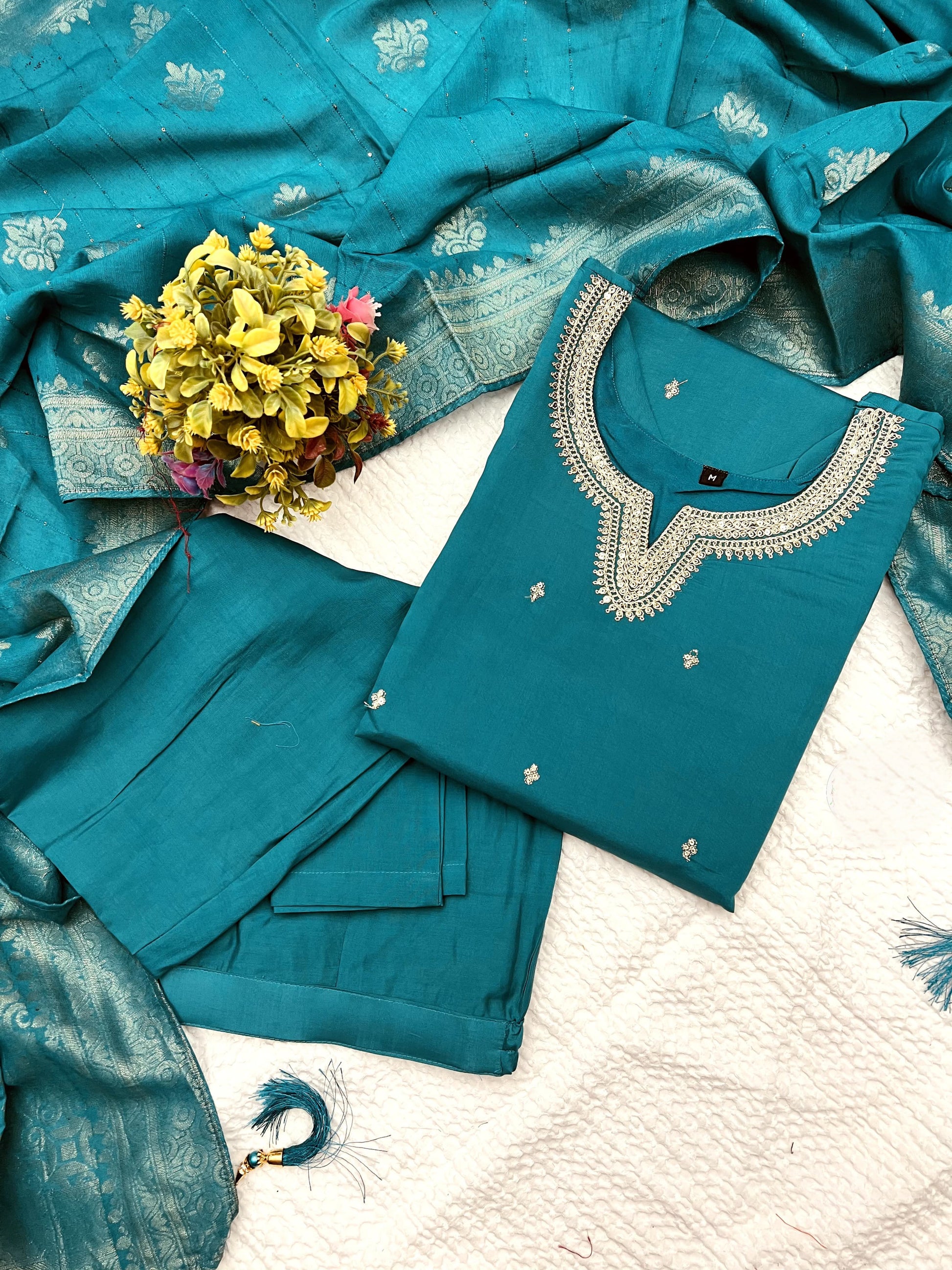 Teal Rama Roman Silk Embroidered Kurta Set with Jacquard Dupatta – Women's Ethnic Wear