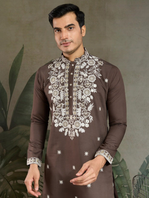 Product Description Of Brown Thread Embroidered Kurta Set Heavy Rayon For Men's