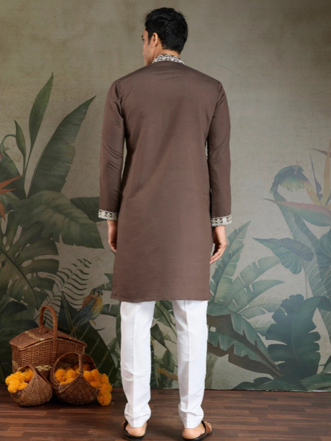 Brown Thread Embroidered Kurta Set Heavy Rayon For Men's